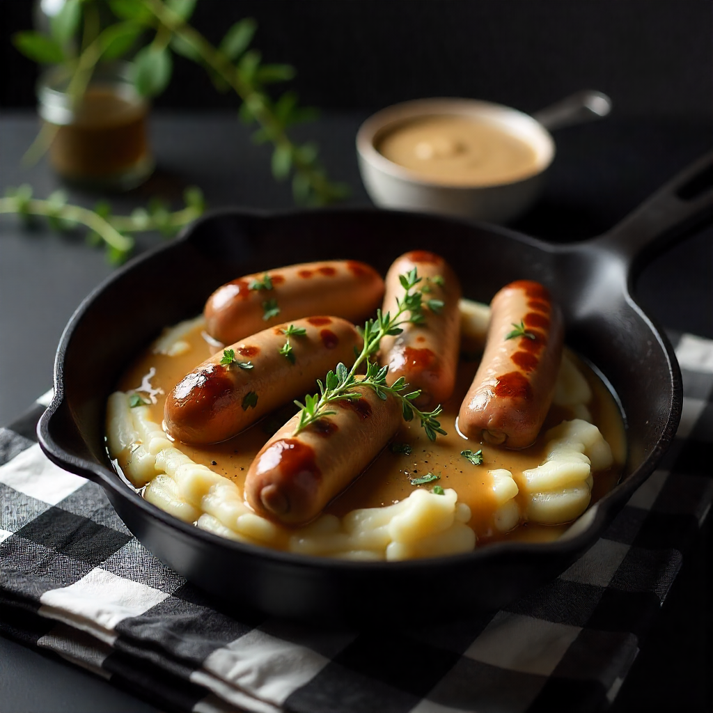 Enjoy a hearty classic with our Pork Sausages served alongside creamy mashed potatoes. The dish is perfectly complemented by a rich onion gravy made with caramelized onions, beef stock, Worcestershire sauce, and fragrant thyme. This comforting meal balances savory flavors and smooth textures, making it an ideal choice for satisfying, homestyle dining.